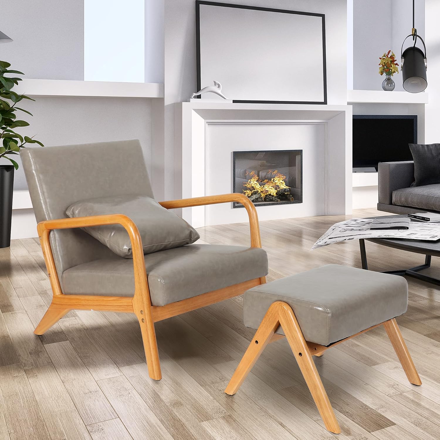 Buy Eluchang Mid Century Modern Accent Chair With Ottoman Wooden Arm Faux Leather Armchair Lounge Chair Seat For Living Room Bedroom Easy Assembly Grey Online At Lowest Price In Saint Helena Ascension And Tristan Da Cunha